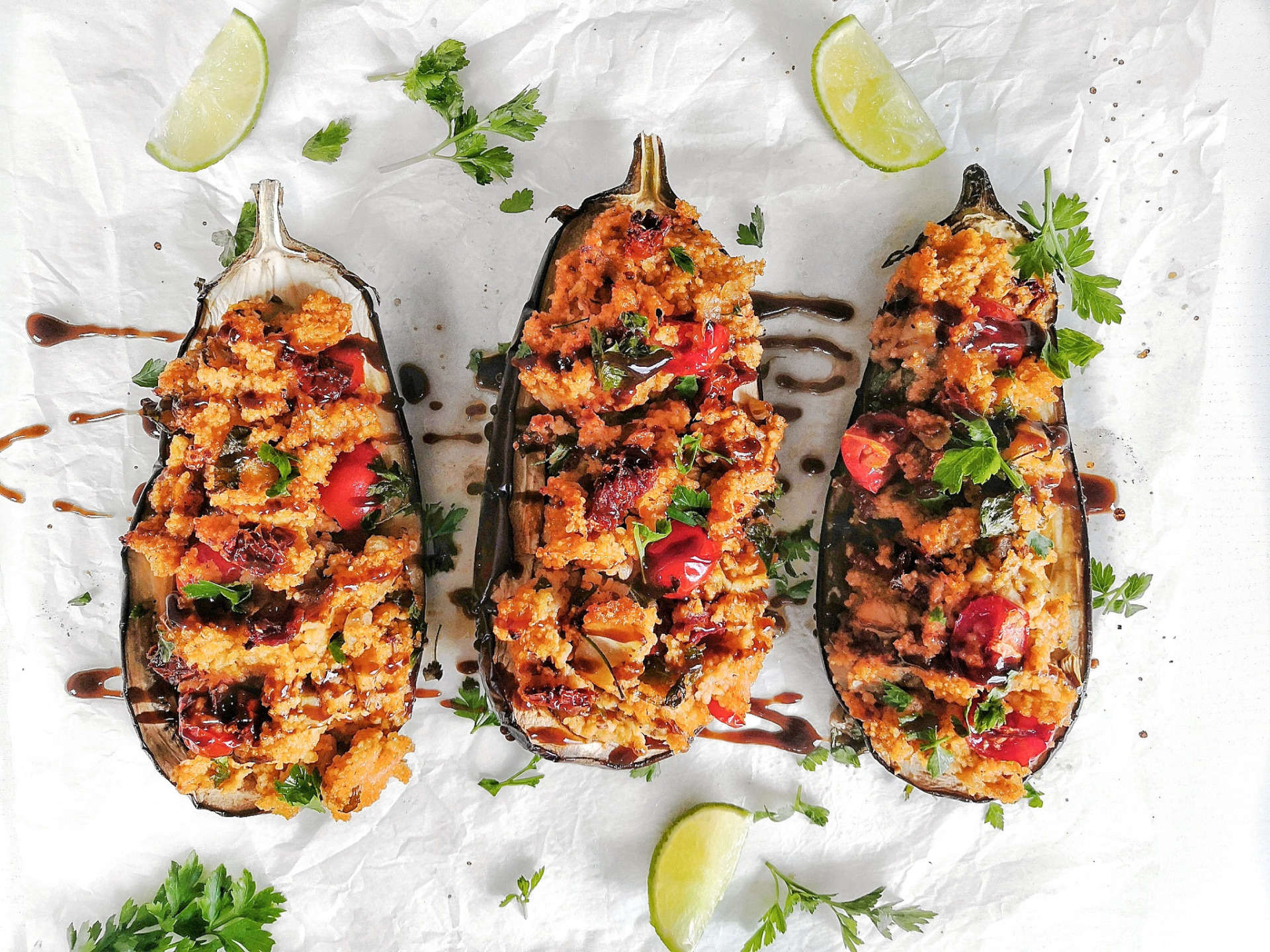 Skvělé zapečené lilky. Nejlepší na nich je, že je můžete udělat z věcí, které vám zrovna přijdou pod ruku. Na směs jsem tady sice zrovna použila quinou, ale výborné jsou i s jáhlami, kuskusem nebo i bulgurem, podle toho, co máte doma.